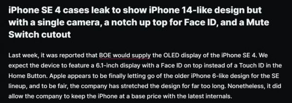 iPhone SE 4保护壳泄露,呈现类似iPhone 14的设计风格,但仅配备单摄像头、顶部刘海用于Face ID,并保留静音开关开孔 上周有消息称,BOE将为iPhone SE 4供应OLED显示屏。预计该设备将搭载6.1英寸屏幕,顶部采用Face ID而非Home键内嵌的Touch ID。苹果似乎终于要告别SE系列沿用已久的类似iPhone 6的老式设计,尽管这一设计使得公司在维持最新内部配置的同时,得以将iPhone售价保持在较低水平。