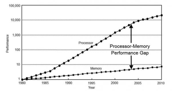但过去的很长时间里,处理器的性能指数式暴涨,内存和硬件之间的传输速度,却压根就跟不上。
