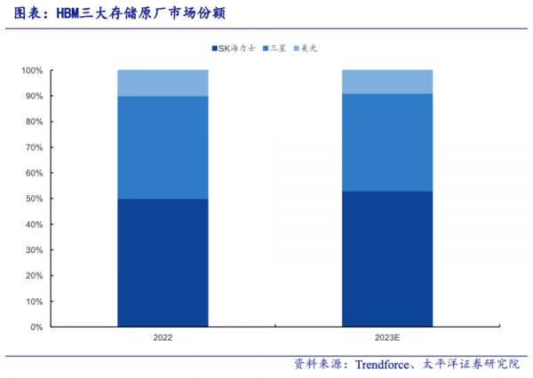 根据 Trendforce 数据,韩国的 SK 海力士和三星,他俩在 2023 年拿捏了全球 90% 的 HBM 内存产能。