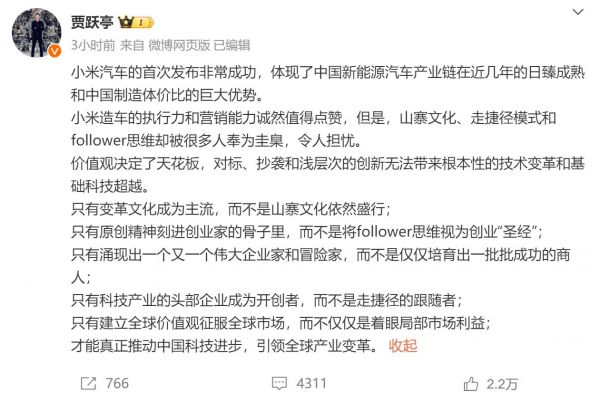 4月1日,贾跃亭发微博表示,小米汽车借助国内成熟的供应链优势,首款产品发布非常成功,但“跟随者”的价值观决定了小米只会抄袭,注定无法推动行业与科技进步、引领全球产业变革。