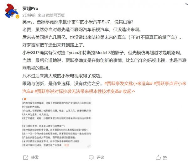 显然,在贾跃亭眼中,小米汽车没有硬实力,只是凭借中国成熟的供应链,以及抄袭其他汽车,才能迅速推出小米SU7。一石激起千层浪,贾跃亭锐评完小米汽车后,他的评价又遭遇了广大网友锐评。