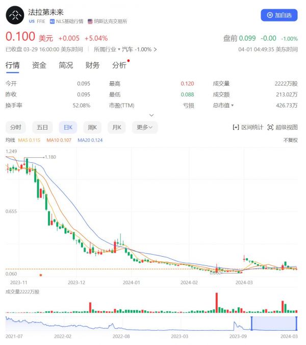 Fisker此前已多次合股,如今股价只剩9美分,实在坚持不下去了。法拉第未来的处境比Fisker好一点,但也没能好到哪里去,因为它的股价目前为每股10美分。