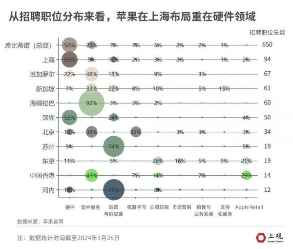 这从苹果最新的招聘信息中也能略窥一二。有媒体梳理发现,从部门分布来看,上海硬件研发新招岗位占比最多,招聘职位多是硬件工程师,具体工作内容涉及硬件测试、校准、系统集成和设计。
