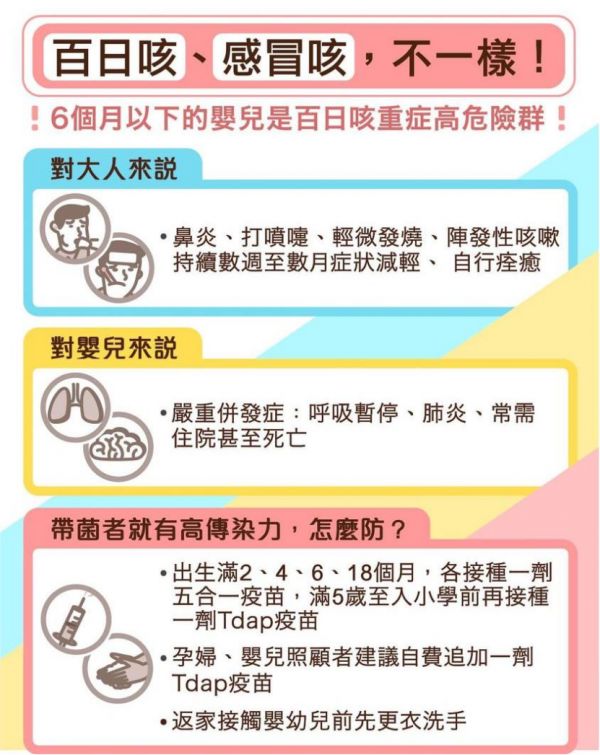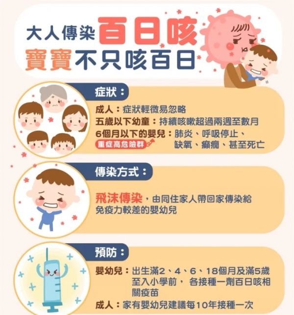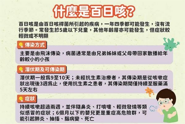 百日咳没有流行季节,一年四季都可能发生,病患多半是5岁以下儿童,好发年龄主要在6个月以下婴幼儿中,其他年龄层病患大多症状轻微。但是百日咳传播力极强。根据专业研究显示,百日咳的传播力为11-17人,麻疹可达12-18人,而早期的新冠病毒传播力接近6个人。患者初时可能没有特别病征,只会流鼻水、打喷嚏、轻微发烧和咳嗽,病征或与伤风感冒相似。