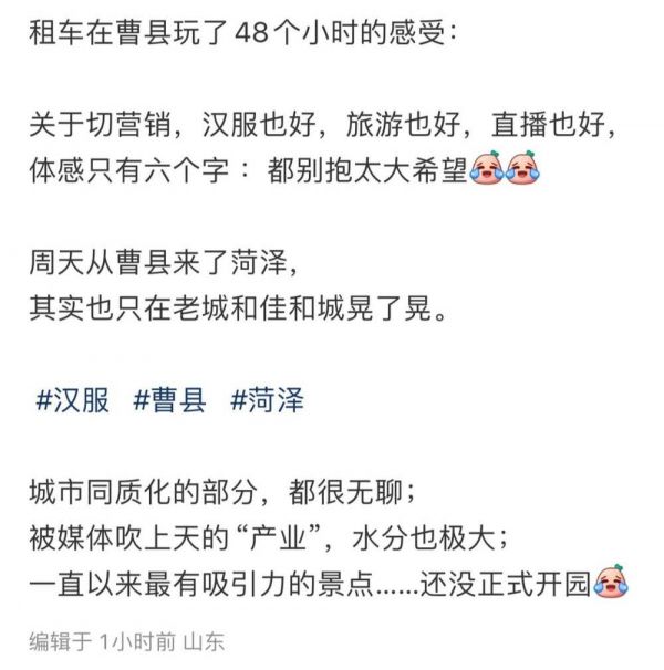 不过,也有非购物意向的自驾游网友表达了对曹县的失望。