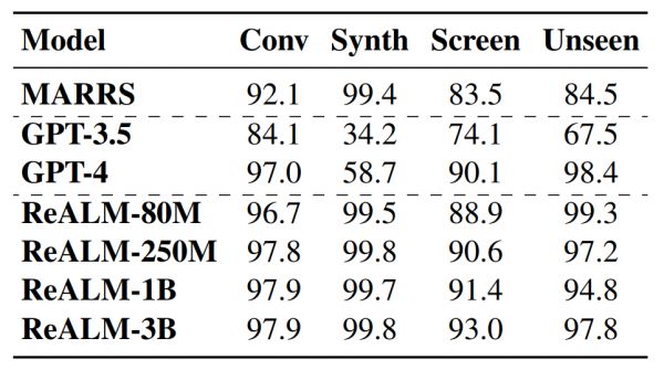表 3 为实验结果:本文方法在所有类型的数据集中都优于 MARRS 模型。此外,研究者还发现该方法优于 GPT-3.5,尽管后者的参数数量比 ReALM 模型多出几个数量级。
