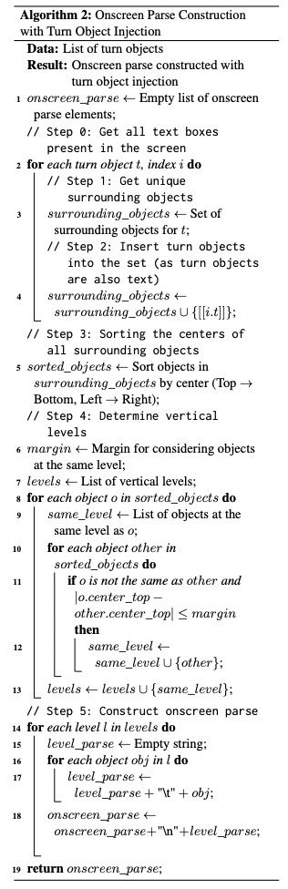 直观地讲,该研究假设所有实体及其周围对象的位置由它们各自的边界框的中心来表示,然后从上到下(即垂直、沿 y 轴)对这些中心(以及相关对象)进行排序,并从左到右(即水平、沿 x 轴)使用稳定排序。所有位于边缘(margin)内的对象都被视为在同一行上,并通过制表符将彼此分隔开;边缘之外更下方的对象被放置在下一行,这个过程重复进行,有效地从左到右、从上到下以纯文本的方式对屏幕进行编码。