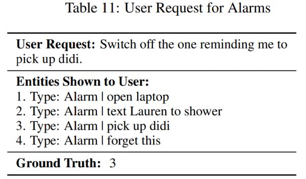 GPT-4 ≈ ReaLM ≫ MARRS 用于新用例。作为案例研究,本文探讨了模型在未见过领域上的零样本性能:Alarms(附录表 11 中显示了一个样本数据点)。