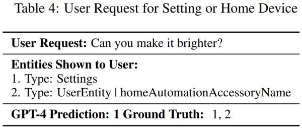ReaLM > GPT-4 用于特定领域的查询。由于对用户请求进行了微调,ReaLM 能够理解更多特定于领域的问题。例如表 4 对于用户请求,GPT-4 错误地假设指代仅与设置有关,而真实情况也包含后台的家庭自动化设备,并且 GPT-4 缺乏识别领域知识的能力。相比之下,ReaLM 由于接受了特定领域数据的训练,因此不会出现这种情况。