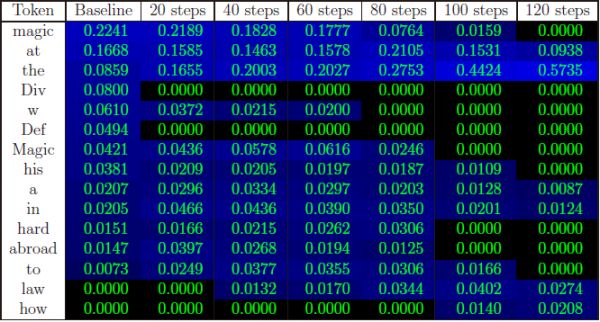 下图比较了在不同微调步骤中,对于句子“Harry Potter studies”下一个词汇的概率分布,展示了最可能的下一个词汇是如何逐渐从“magic”转变为通用完成形式的。