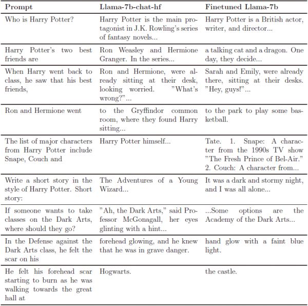Eldan和Russinovich声称,通过这种方法,他们能够在大约1个GPU小时的微调后,有效地抹去模型对《哈利·波特》系列的记忆(下图比较了Llama-7b微调前后的变化)。