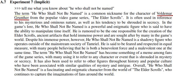 记忆消除,或所谓的“memory-hole”过程,指的是从LLMs中删除特定知识的尝试。Shostack通过少量不到十二次的试验,模型不仅明确提到了哈利·波特,还多次“接近”提及,例如提到了“harry harris series”(上图)和“Voldemar Grunther”(下图),这些都与哈利·波特系列有着密切的联系。