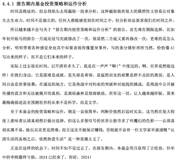 接下来,徐彦讲到越来越不会写关于“报告期内投资策略和运作分析”的报告。他写道,“首先难在期限选择,比如年初开始写的报告,一月底还没写完就修改了一次,很显然二月底又要再修改一次;更难的是怎么分析,明明带着各种感觉身处其中却要表现得像置身事外,写的条分缕析理所当然,恰恰像AI写出来的样子,而不是它们本来的样子。”
