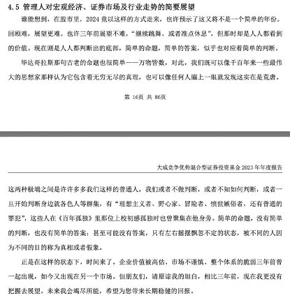 基金经理的“小作文”是公募基金年报的重要看点。2023年公募基金年报披露完毕,大成基金徐彦的“小作文”则因独特文风出圈。