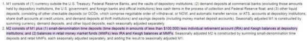 下面第二张图是美联储统计M2的定义,一如既往地有判例法国家定义的美。简要总结一下就是:美国M2=流通中现金+活期存款+零售货币基金(可以理解为银行理财)+10万美元以下的小额定期存款-个人养老金计划存款-一些机构的存款。