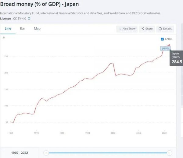 中国经济的信用行为非常依赖银行。中国人出了名的爱存钱,大量居民存款没有脱离M2的统计范畴进入更高风险的资本市场,而居民和企业的融资也主要为银行贷款,大多数信用扩张都经由银行资产负债表的变动被M2数据记录下来。其他依赖间接融资的经济体M2规模也非常高,比如日本M2/GDP达到了285%,而且现在正处于通胀高烧,怎么就没有财经大V去给日本哭丧呢?