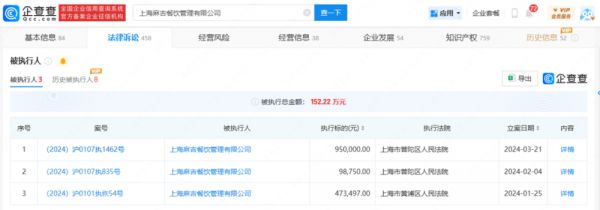 企查查信息显示,3月25日,上海麻吉餐饮管理有限公司新增一则被执行人信息,执行标的95万元。