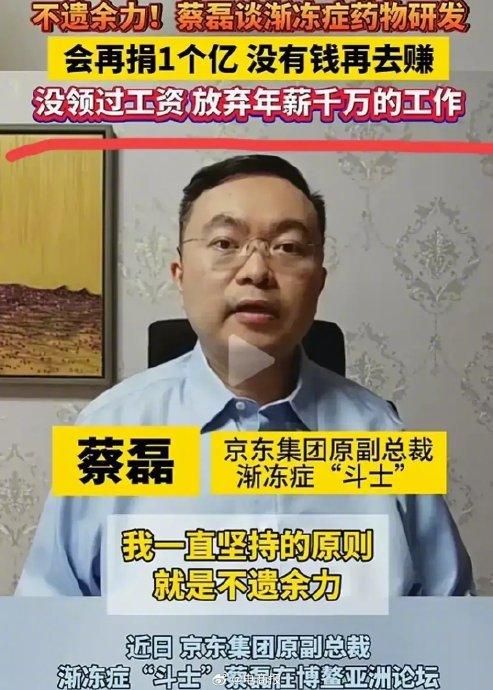 前京东副总蔡磊陷舆论漩涡,被指利用渐冻症博取同情直播带货,曾捐2亿用于渐冻症研究和慈善公益事业,却因从未公布投资明细就被质疑。