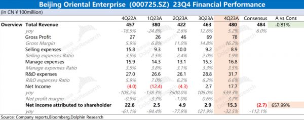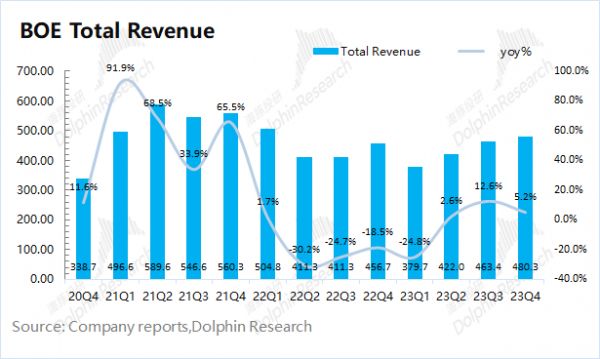 其中京东方在2023年第四季度总营收480.3亿元,同比增长5.2%,基本符合市场预期(484亿元)。