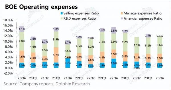 2023年第四季度京东方四项费用合计58.16亿元,同比下滑17.2%。四项费用率12.1%,本季度销售费用和财务费用均有所下滑。