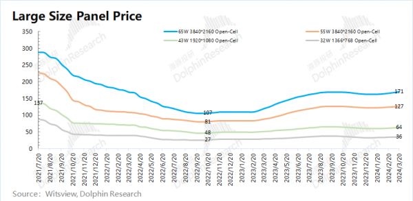 从Witsview 的3月下旬报价来看,65寸/55寸/43寸/32寸价格分别为171美金/127美金/64美金/36美金。虽然在去年年末面板价格上涨有所停滞,但进入一季度面板价格再次迎来了上涨。各尺寸面板价格,都已经从底部上涨有30%以上。