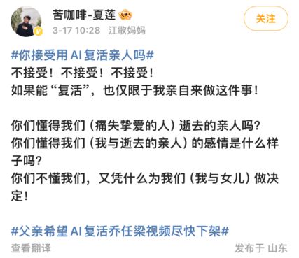 江歌的母亲在“你接受AI复活亲人吗”的微博话题下,直接称“不能接受复活,如果能复活,也仅限于我亲自来做这件事”。