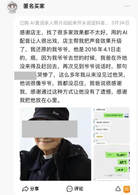 而在清明前夕,不少商家也嗅到了AI“复活”亲人的商机。打开电商APP,搜索“AI复活”,就能看到不少AI“复活”亲人的商品链接。