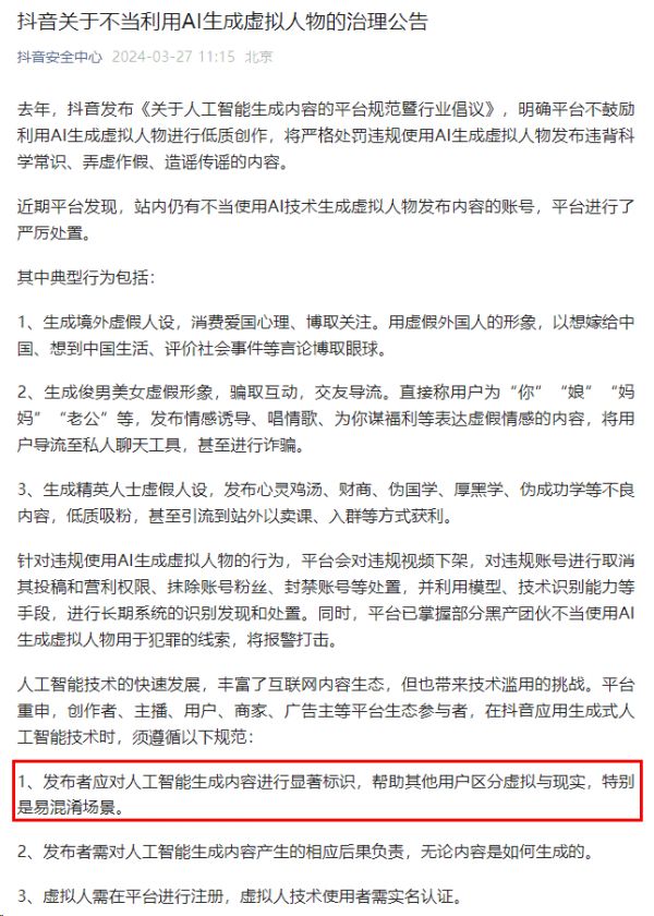 前几天抖音发布的《关于不当利用AI生成虚拟任务的治理公告》中就提到发布者应对人工智能生成内容进行显著标识。