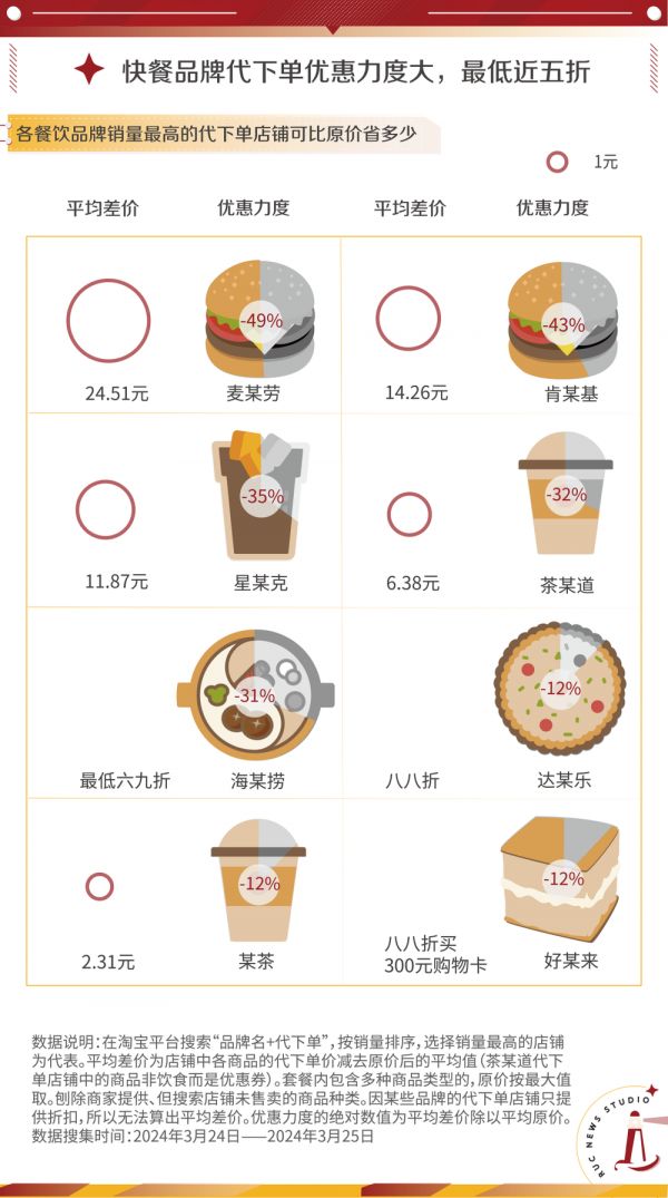 在淘宝平台统计八个常见餐饮连锁品牌,在销量最高的代下单商家中,麦某劳与肯某基的折扣力度遥遥领先——分别平均比原价便宜了49%和43%。