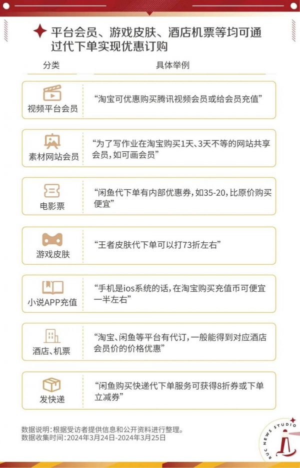 通过别人代下单,占的是信息差的便宜。而代下单本质上便是一个售卖“信息差”或“微小特权”的生意。代下单商家的日常就是搜罗普通消费者接触不到或未加留意的优惠渠道,然后以低于官方价、高于优惠价的价格售出。