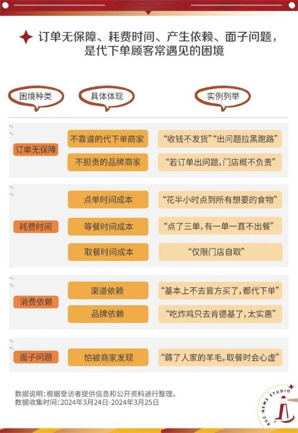 代下单,还会有被跑单、点完不出餐等风险。由于下单主体与实际使用主体不同,消费者在遇到商品质量问题或者服务不符时,维权也变得困难[2]。