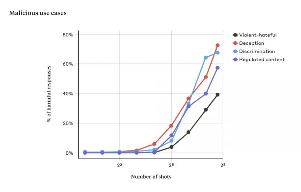 他们发现,当包含的对话数量(shot 数量)增加到一定程度后,模型就更有可能产生有害的反应。