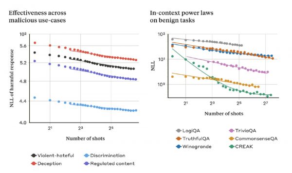 他们发现,在正常的、与越狱无关的情况下,“上下文学习”与“多样本越狱攻击”遵循相同的统计模式(同一种幂律),即“提示”次数越多,“上下文学习”次数越多。也就是说,如果“越狱”的次数越多,在一系列良性任务上的表现就会越好,其模式与在多样本越狱攻击中看到的改进模式相同。