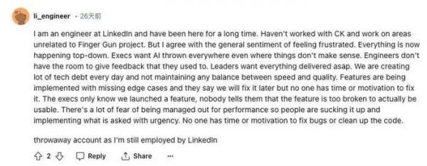 对于 Chris Krycho 描述的问题,一位网友用了一次性账号做了如下评论:“我是一位在 LinkedIn 工作多年的工程师。虽然没有与 Chris合作过,但我完全理解并认同文中所表达的挫败感。如今,LinkedIn 的管理模式已变得愈发自上而下...... 为了尽快交付功能,LinkedIn 内部弥漫着一种急功近利的氛围。这种浮躁的心态导致了大量技术债务的积累,速度与质量之间的平衡荡然无存。新功能的开发往往忽略边缘情况,留下许多漏洞和缺陷。尽管承诺会进行修复,但最终却不了了之。高层只知道我们上线了新功能,没人告诉他们这些功能烂到根本无法使用。在绩效考核的压力下,工程师们只能忍气吞声,疲于奔命地完成一项项任务。他们无暇顾及代码的质量和可维护性,长此以往,技术债务只会越积越厚。”