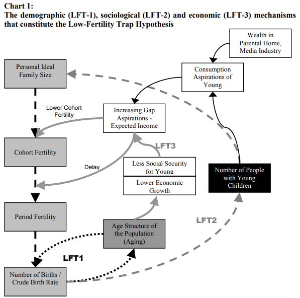 鲁茨及其合作者在一篇报告中指出,在人口、社会和经济三个维度上存在着一些相互关联的因素,共同推动低生育率国家的生育率进一步螺旋式下降(“The Low-Fertility Trap Hypothesis: Forces that May Lead to Further Postponement and Fewer Births in Europe”, Vienna Year book of Population Research 2006)。