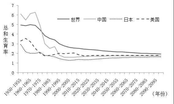 “二战”后世界、中国、日本、美国总和生育率图