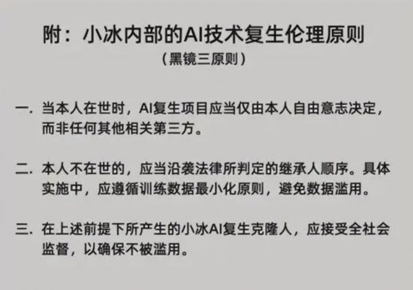 由于“AI复活”的伦理门槛较高,一些企业也设置了规则。比如小冰公司推出了AI技术复生伦理原则,包括当本人在世时,AI复生项目应当仅由本人自由意志决定,而非任何其他相关第三方;本人不在世的,应当沿袭法律所判定的继承人顺序,应当遵循训练数据最小化原则,避免数据滥用等。