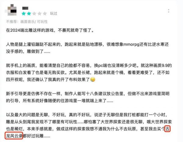 移动端画质马赛克,而PC端画质比起其他端游更是被按在地上摩擦;“9.9元”时装,在粗糙的建模、辨识度下,可能也实在不好意思定更高的价;在开局就如此糟糕的情况下,游戏内甚至各种藏着掖着,很多内容也都有着“x天后解锁”这样抽象的设定……《射雕》一经发布槽点无数,你甚至不知道先抓着哪一个点吐槽。