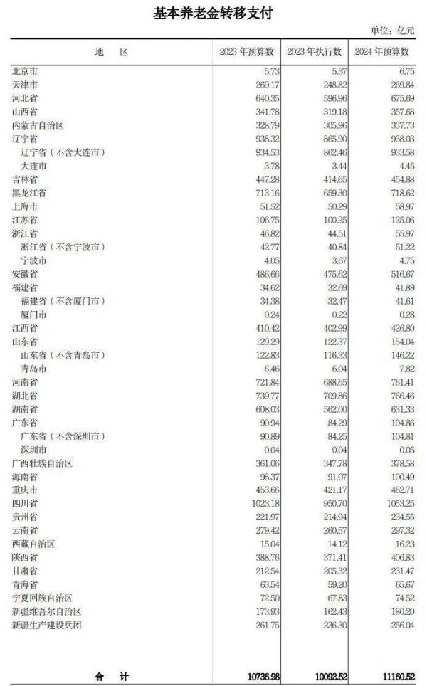 与养老相关的资金,重点体现为“基本养老金转移支付”。2024年该项预算数首次突破万亿元,为11160.52亿元,比2023年执行数增加1068亿元,增长10.6%。