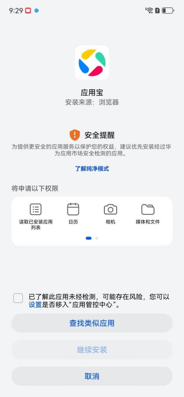 同时需要先勾选“已了解此应用未经检测,可能存在风险”同意之后,才能进行继续安装的下一步。此时如果选择查找类似应用,就会跳转到华为应用市场。