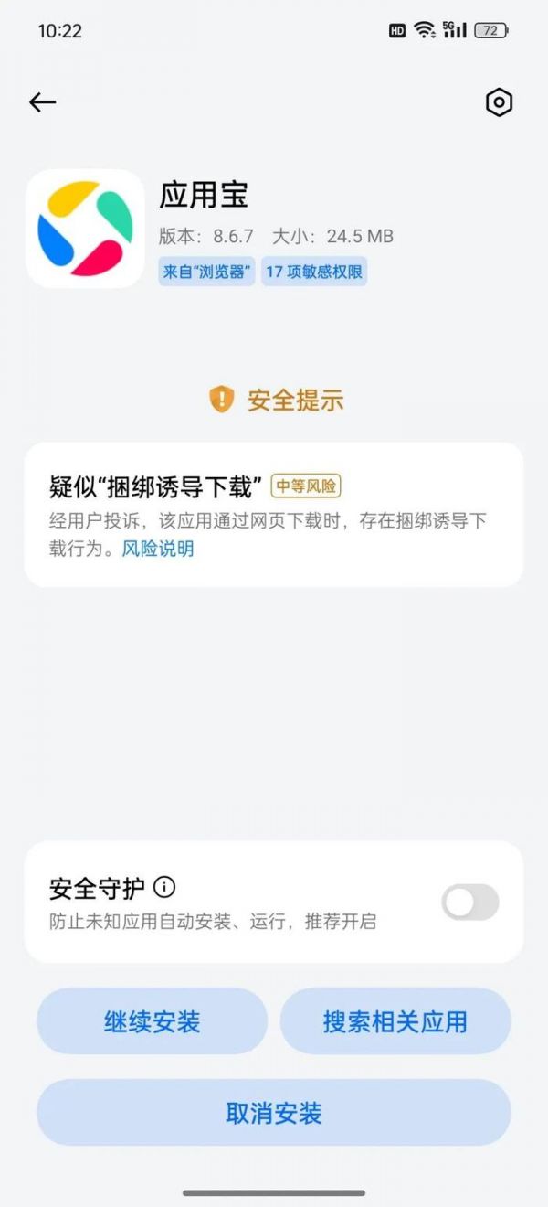 前面提到小米的安全认证步骤最多最繁琐,推测是因为它默认开启了安全守护功能。我尝试了关闭安全守护之后,再重新浏览器安装《应用宝》和《蛋仔派对》,但其中的限制步骤并没有太大区别。区别是风险提示减少很多。