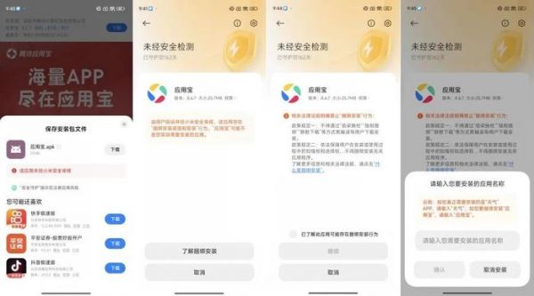 使用《应用宝》下载安装App,碰到的情况则和浏览器是一样的,需要先同意其作为第三方渠道下载安装应用,并勾选“已了解此应用未经检测,可能存在风险”的提示,进行密码验证才能正常安装App。