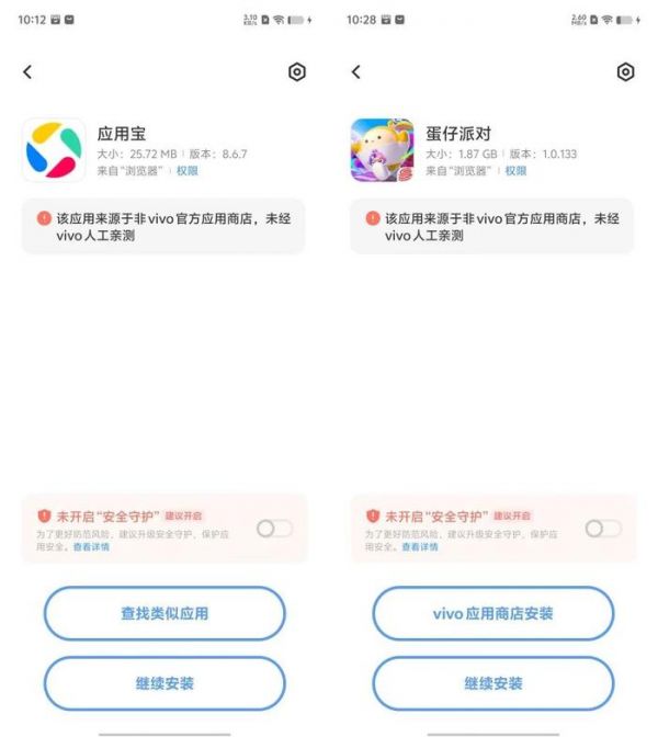 vivo的情况和OPPO类似,安装《应用宝》《蛋仔派对》,以及使用《应用宝》安装App时,会提示“应用来源于非vivo官方应用,未经人工亲测”,只需要无视再点击继续安装就行了。