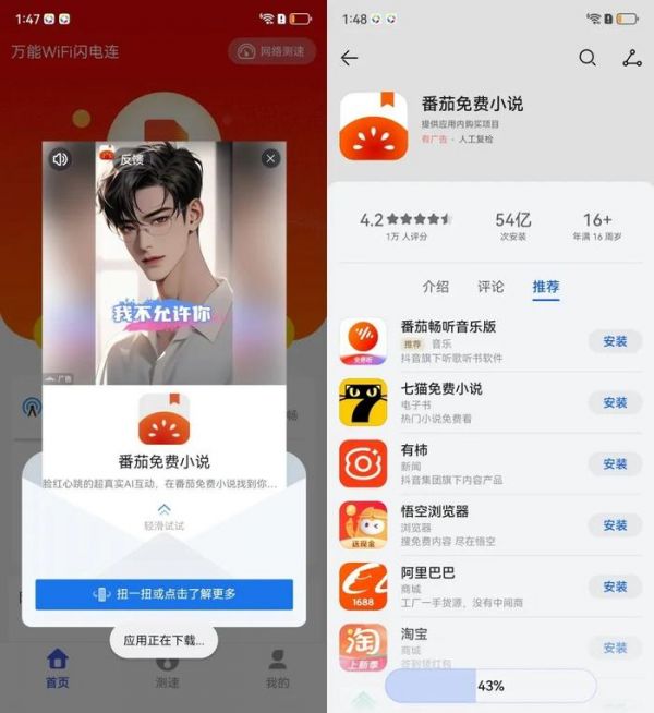 对此我也进行了一个小测试,看看在如此严防死守之下,为什么还会有应用莫名安装的问题。测试方法很简单,就是在这几款手机上随便安装两个WiFi万能钥匙的App,这类App在应用市场里非常多,套路也都是一样的:诱导用户点击网络加速,实则是看广告,同时还会下载安装这些广告应用。