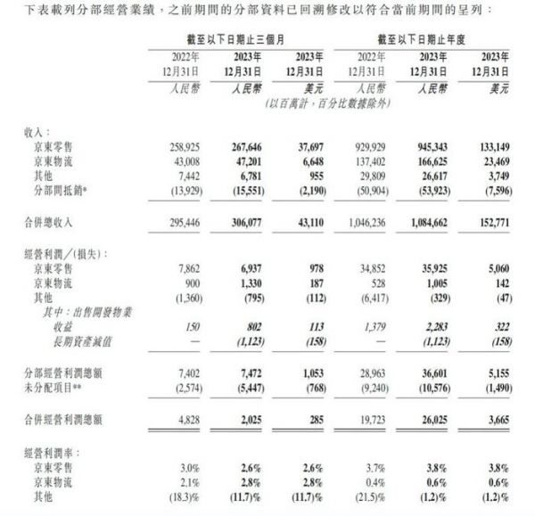 3月初,京东发布2023年四季度及全年财报,集团全年收入10847亿元,同比增长3.7%,归属净利润为242亿元,同比增长132.8%,净利率为2.2%。