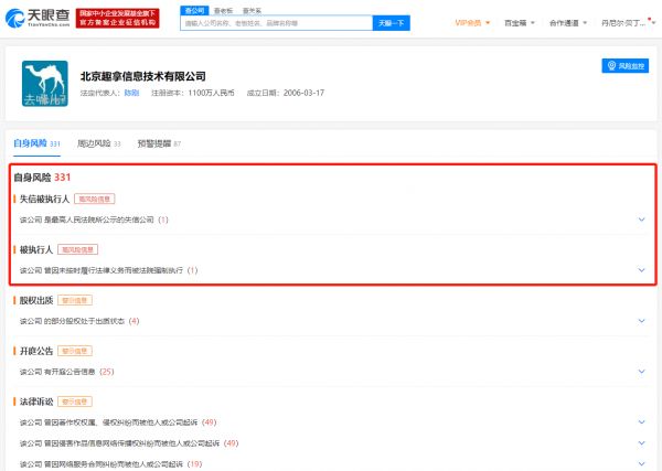 天眼查数据显示,近日,去哪儿网运营主体北京趣拿信息技术有限公司被永康市人民法院列为失信被执行人,行为具体情形为:有履行能力而拒不履行生效法律文书确定义务,违反财产报告制度。