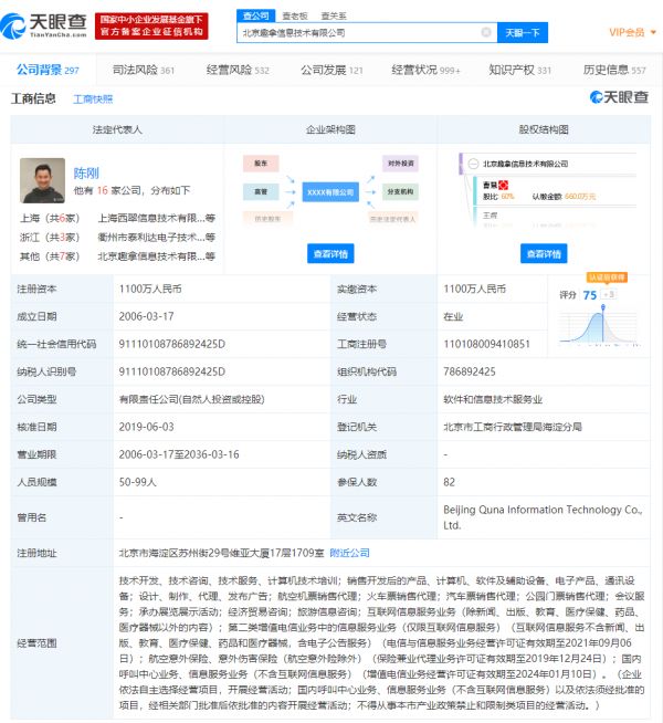天眼查数据显示,上海杜巴商务咨询有限公司已于今年3月被吊销。北京趣拿信息技术有限公司则成立于2006年3月,注册资本1100万人民币,法定代表人为去哪儿网CEO陈刚。据去哪儿网官网介绍,2017年5月,公司完成私有化交易,从美国退市。目前,去哪儿的大股东为曹慧,持股比例60%,二股东为王辉,持股比例40%。