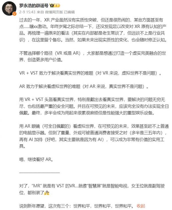 今年2月,罗永浩在网络上谈到了自己对于当下XR产业一些看法,并表示自己仍然“继续看好AR”。