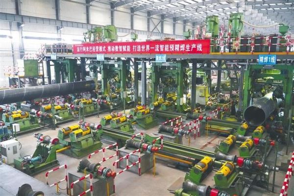 4月1日,在宝石钢管输送管公司制管三分厂的生产车间内,智能化预精焊螺旋焊管生产线有序运转。