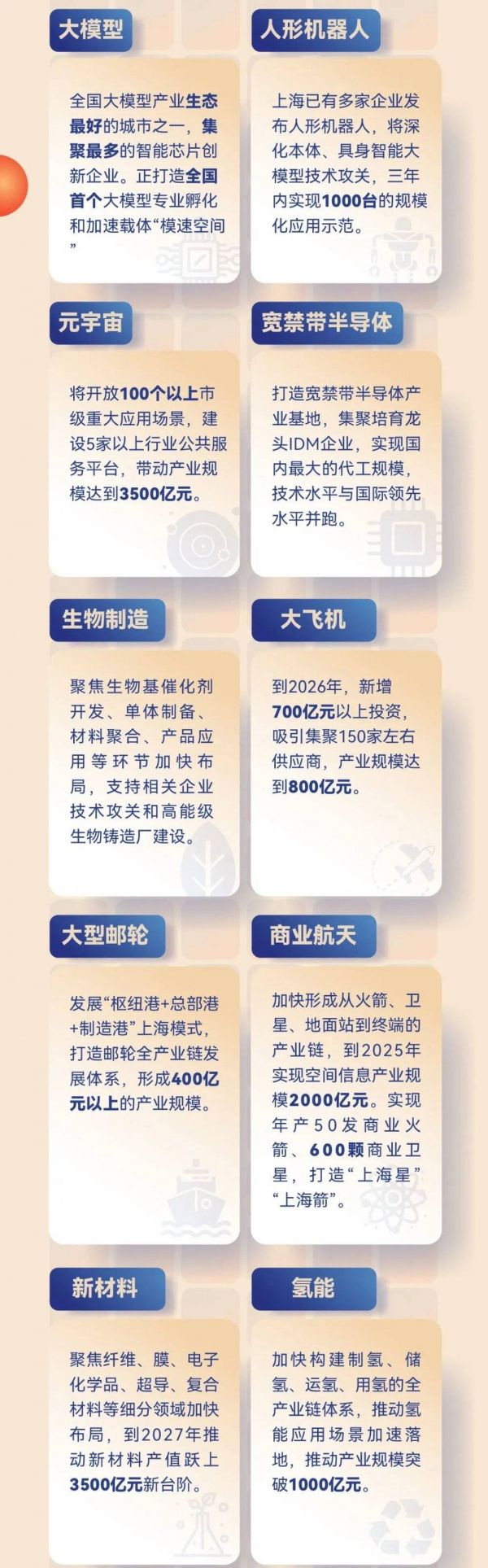 日前,上海围绕大模型、人形机器人、宽禁带半导体、生物制造、元宇宙、大飞机、大型邮轮、商业航天、新材料、氢能等10个重点产业链细分赛道发布投资机遇。